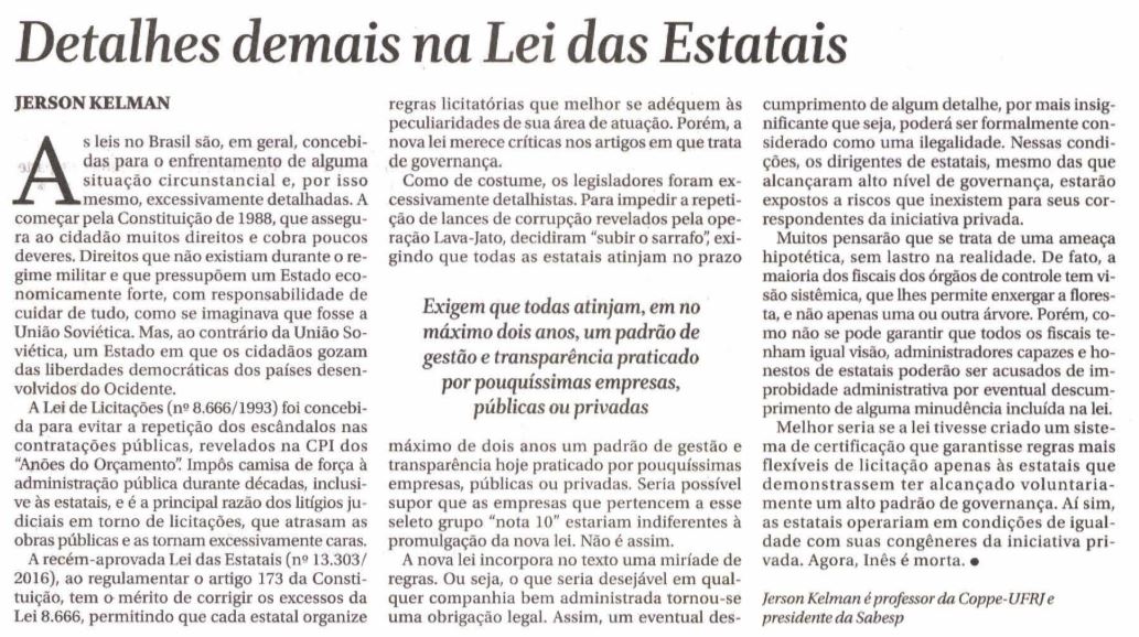KELMAN, J. O Governo Tarcísio deve privatizar a Sabesp? Sim, Folha de SP, 23/12/2022.