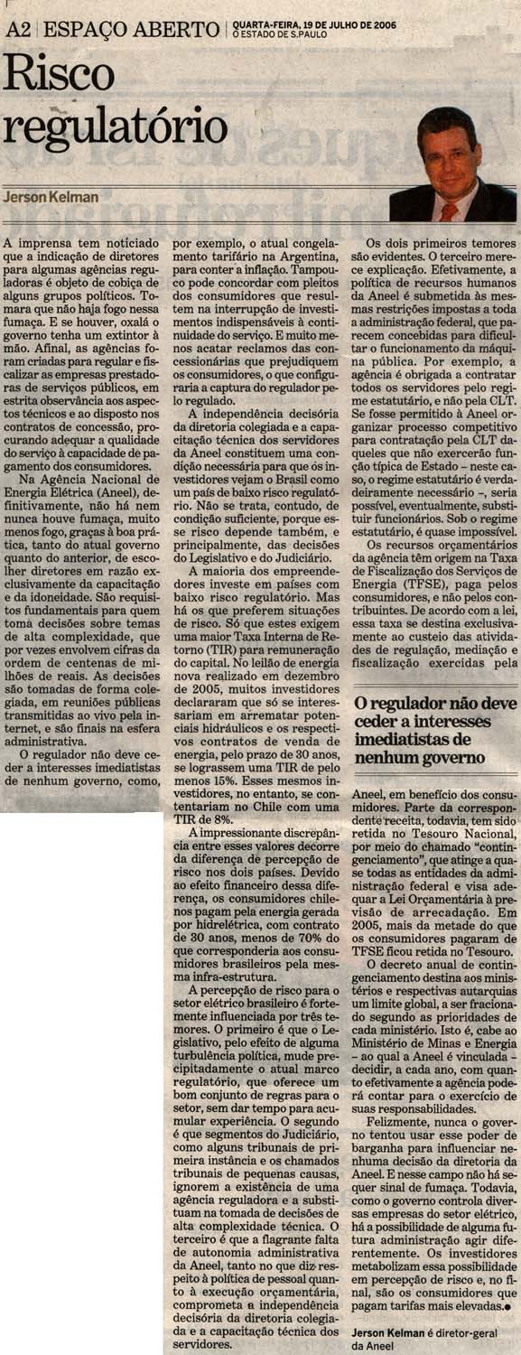 KELMAN, J. Proposta de resolução para a ANEEL, Brasil Energia, 29/07/2025